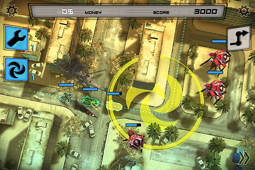 Once you’ve planned your route, it’s time to set off, and your convoy slowly starts to progress through post-apocalyptic versions of Baghdad and Tokyo with you running along side them. It’s when the action starts that your role as the player really comes into it’s own. The Commander (you) and the convoy have a rather symbiotic relationship. You can take damage and die (although you’ll re-spawn after a short period- it’s when the convoy is destroyed that it’s game over) and the only way to heal yourself is to hover around your convoy. But the convoy doesn’t stand a chance without the power-ups that you provide. These include health boosts; smoke-screens which confuse enemies and cause them to miss; decoys which soak up the enemy fire keeping them busy while your forces go to work on them; and later, the ability to drop nukes. Dropping a power-up creates a circular ‘zone’ where the effects will be active. For example, when dropping a health boost, the units will heal while they’re driving through the ‘zone’. So where and when you drop them is a lesson in strategy. The game doesn’t spoil you with endless goodies either. Many a time I found myself holding off on dropping a smoke-screen or deploying a decoy, not knowing when the next drop of fresh supplies was going to arrive. It quickly becomes an art of rationing. When you do get a supply drop, it’s nothing short of thrilling. Often, power-ups will be dropped off the beaten path, forcing you and the convoy apart, which is dangerous for both parties. It is truly satisfying when you sprint back towards your convoy, fully restocked, just in time to drop a vital health boost.